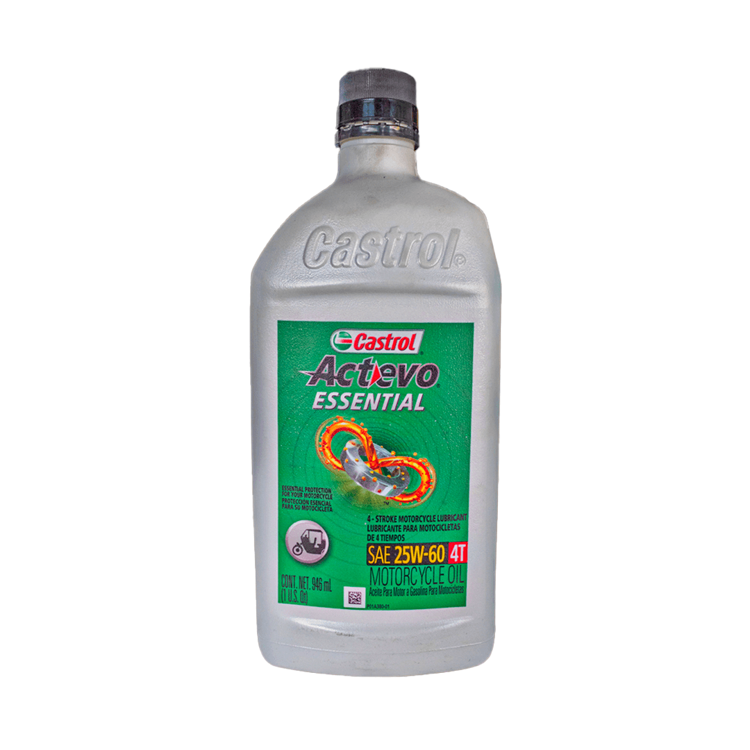 Castrol Actevo Essential 4‑T 25W60 es un aceite para motor mineral de alto desempeño formulado para motocicletas de 4 tiempos, para motos carburadas y con inyección. Su viscosidad 25W60 lo hace ideal para climas cálidos y motocicletas en uso exigente, aportando estabilidad de la película lubricante y control eficiente del calor.