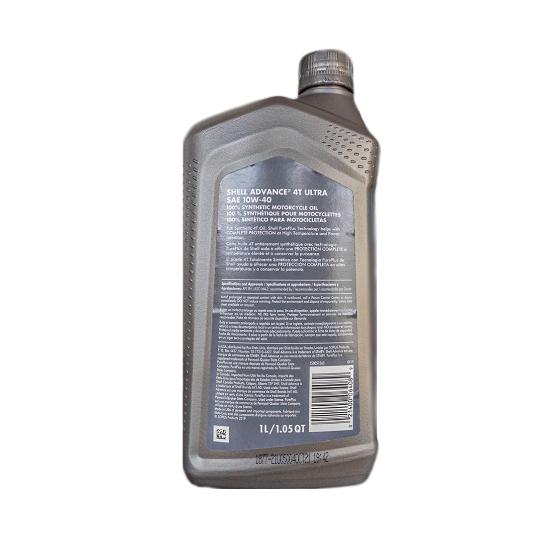 El Shell Advance Ultra 10W40 4T combina un aceite base sintético derivado del gas natural con aditivos de limpieza activa, asegurando un motor más limpio y eficiente por más tiempo.